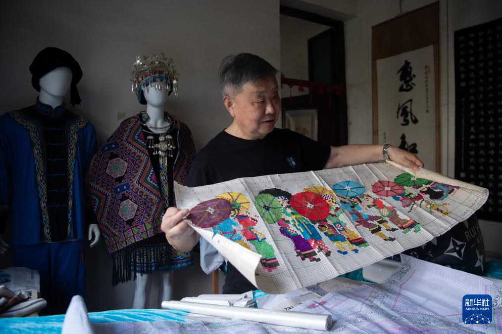 7月2日,湖北省来凤县桂花树社区,唐洪祥在家中展示西兰卡普图纸。