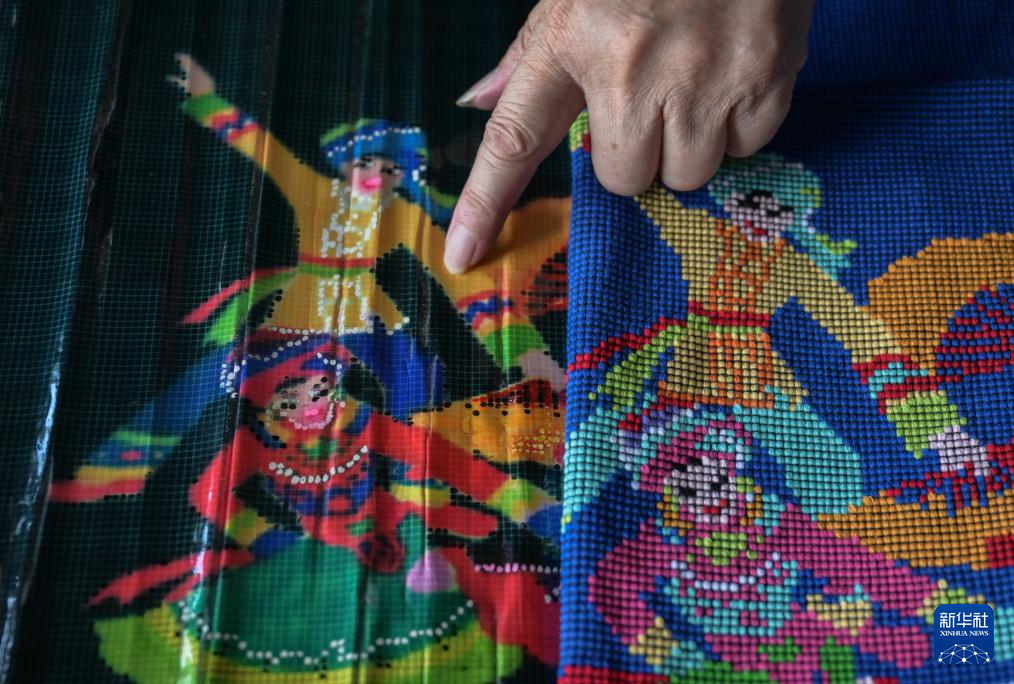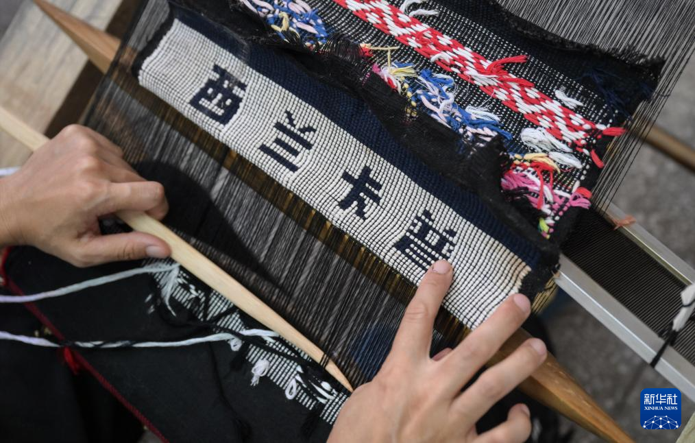 湖北省来凤县桂花树社区,一件“西兰卡普”字样的作品在织机上成形(7月2日摄)。