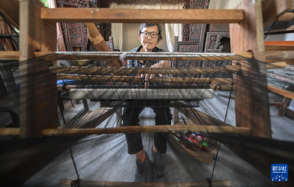 7月2日,湖北省来凤县桂花树社区,唐洪祥的老伴刘秀琴在操作织机。
