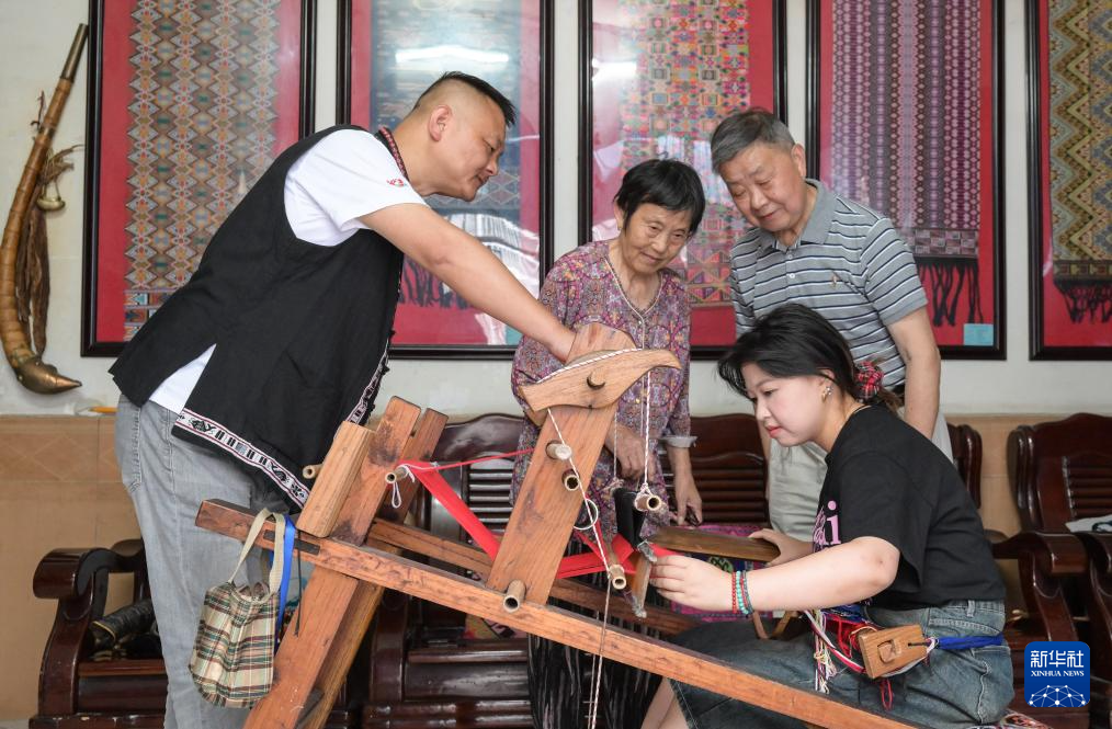 7月2日,湖北省来凤县桂花树社区,唐洪祥的老伴刘秀琴(左一)指导前来学艺的学员们操作织机。