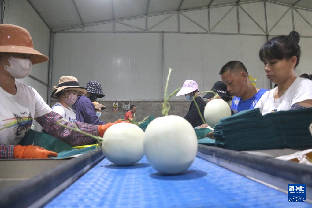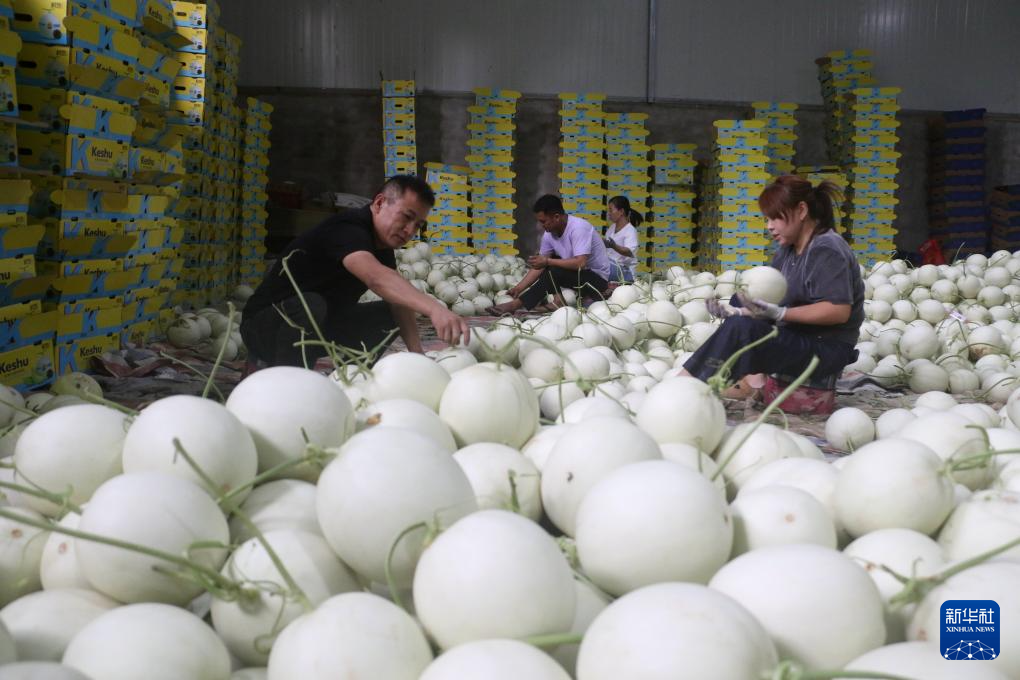 7月19日,工人在敦煌市莫高镇泾桥村特色林果外包装分销中心分拣蜜瓜。