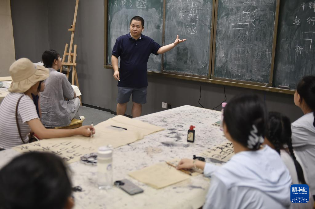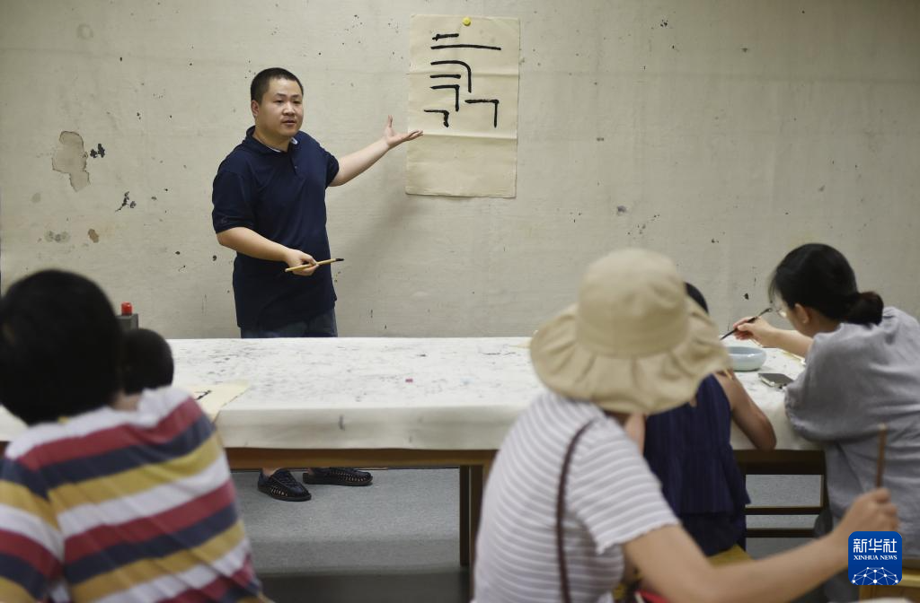 7月20日,授课老师在香河县文化馆的“书法公益培训班”上为学员讲解用笔要领。