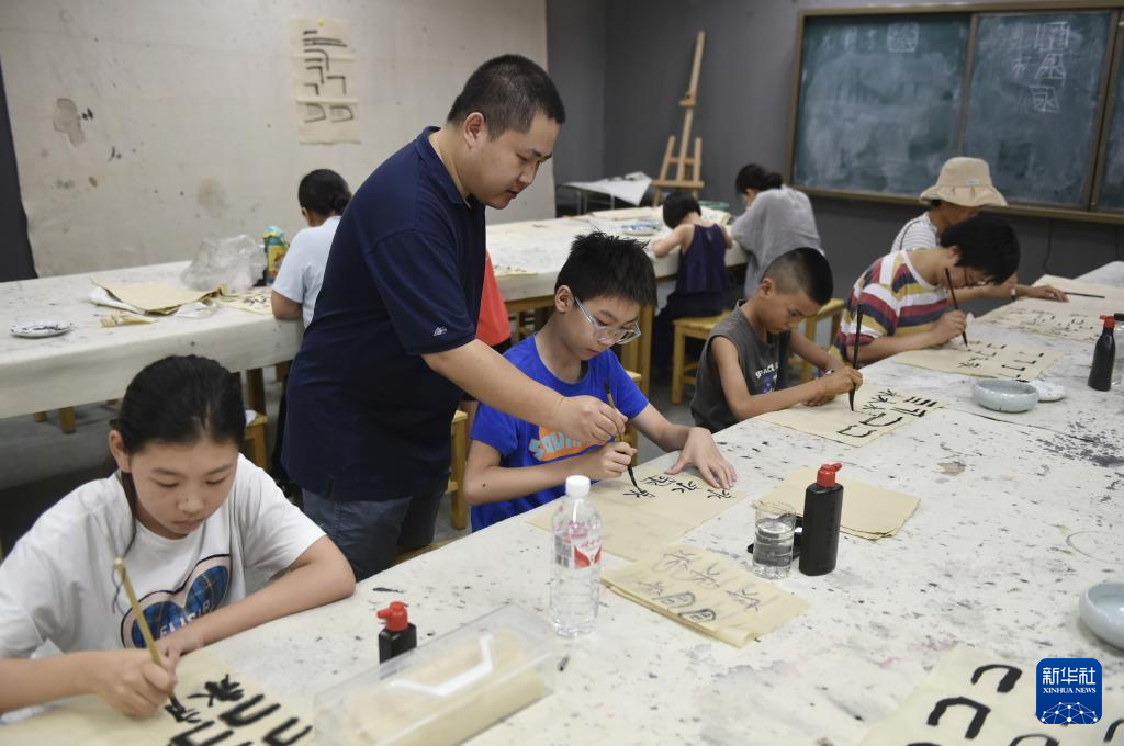 7月20日,授课老师在香河县文化馆的“书法公益培训班”上指导学员练字。
