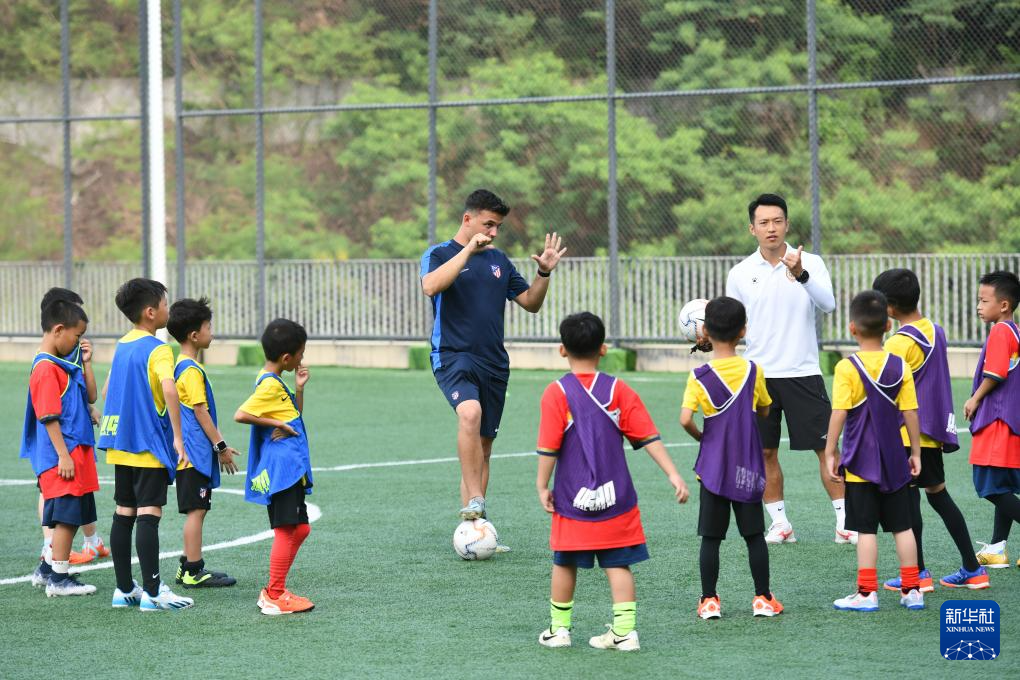 7月16日,来自马竞U12梯队的教练员卡斯塔尼奥(中)为孩子们上课。