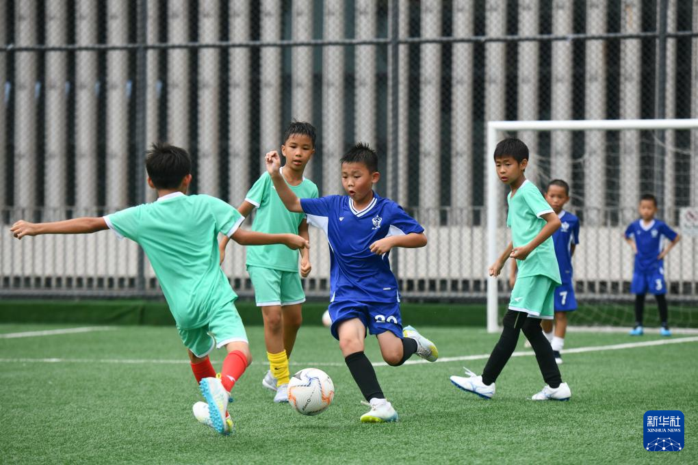 7月19日,来自贵州省榕江县的足球少年张洋(中)在比赛中拼抢。年仅9岁的他在当天的比赛中为队伍贡献了六粒进球。
