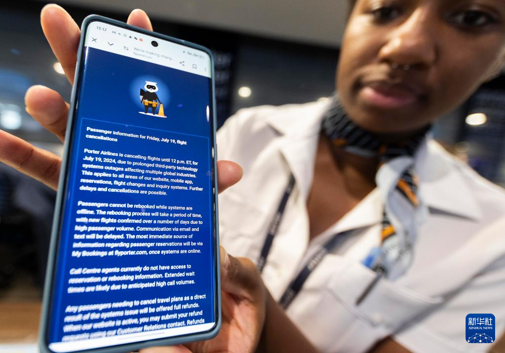 7月19日,在加拿大多伦多比利·毕晓普机场,一名波特航空公司的工作人员用手机显示因技术故障取消航班的网络通知。
