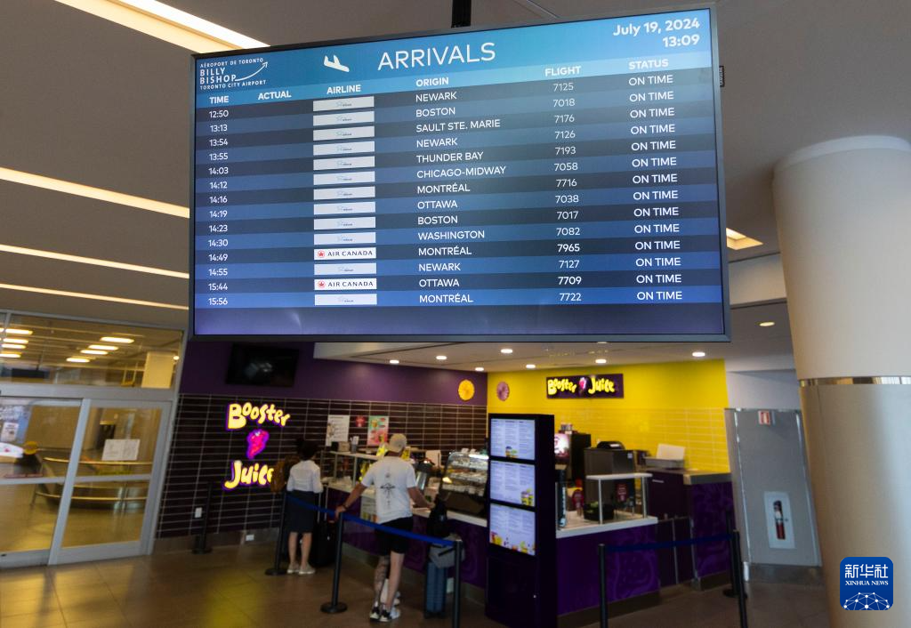 这是7月19日在加拿大多伦多比利·毕晓普机场拍摄的因无法登录操作而继续显示错误航班信息的屏幕。