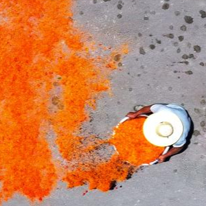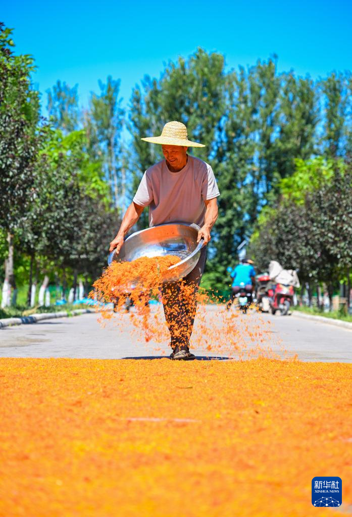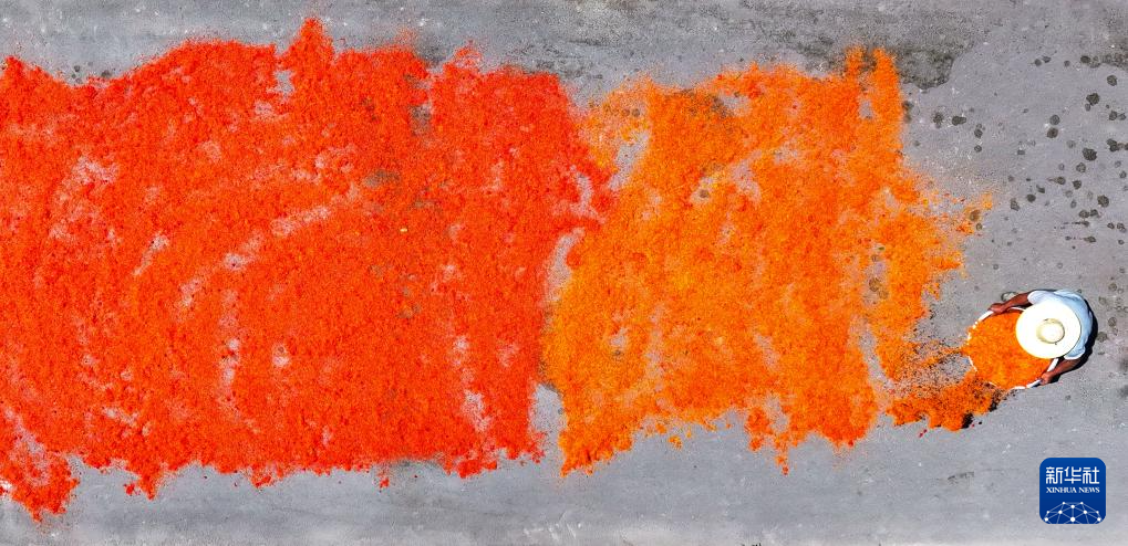 7月20日,农民在路边晾晒中药材红花(无人机照片)。