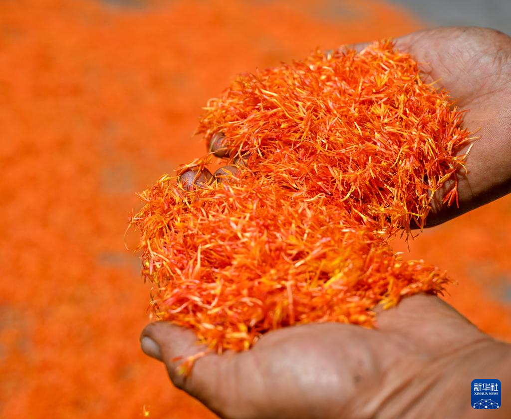 这是7月20日在新疆巩留县拍摄的采摘下来的中药材红花。