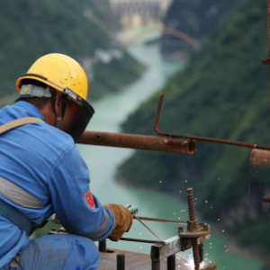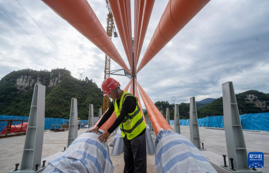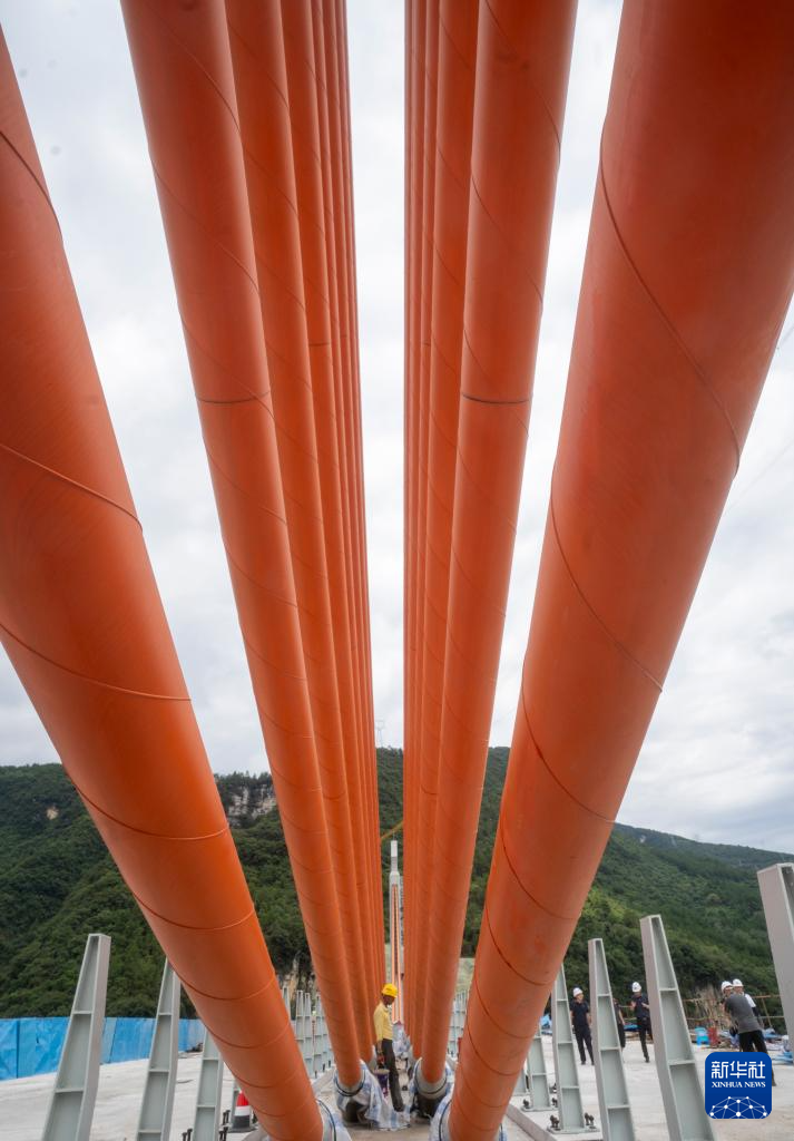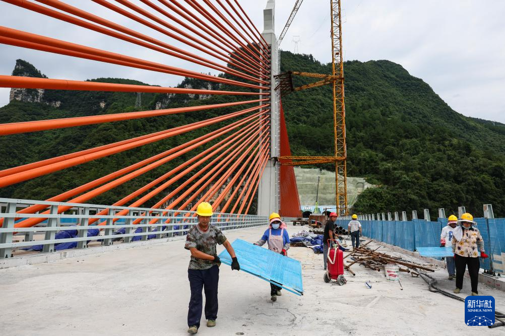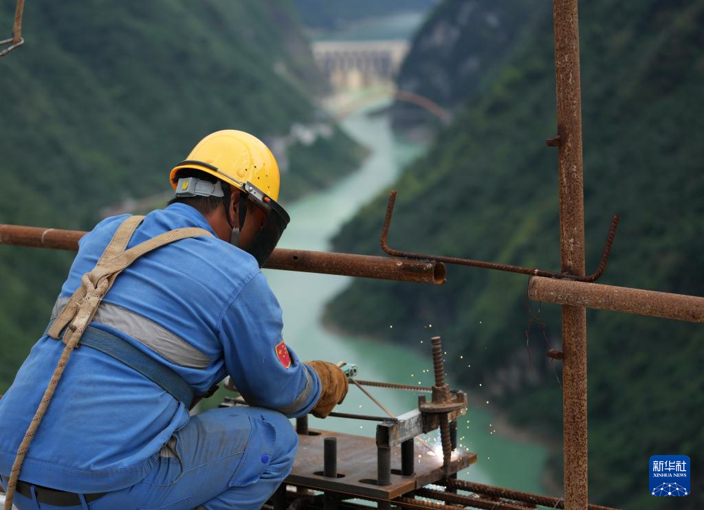 7月20日,工人在渝湘复线高速磨寨乌江特大桥建设现场施工作业。