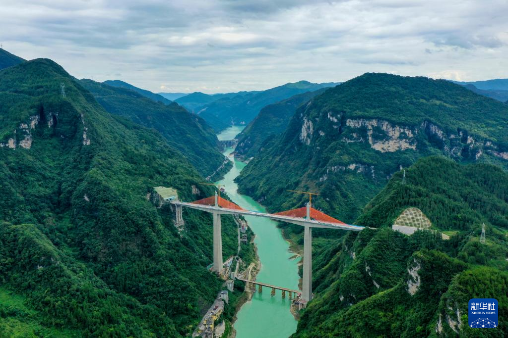 这是位于重庆市彭水县境内的渝湘复线高速磨寨乌江特大桥建设现场(7月20日摄,无人机照片)。