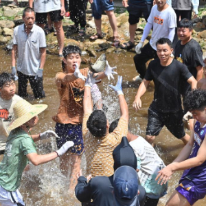 7月21日,在融水苗族自治县红水乡良双村闹鱼节活动中,村民和游客在河里抓鱼。今年,良双村利用粤桂协作资金,对河道进行了整治和改造,提升旅游基础设施条件。
