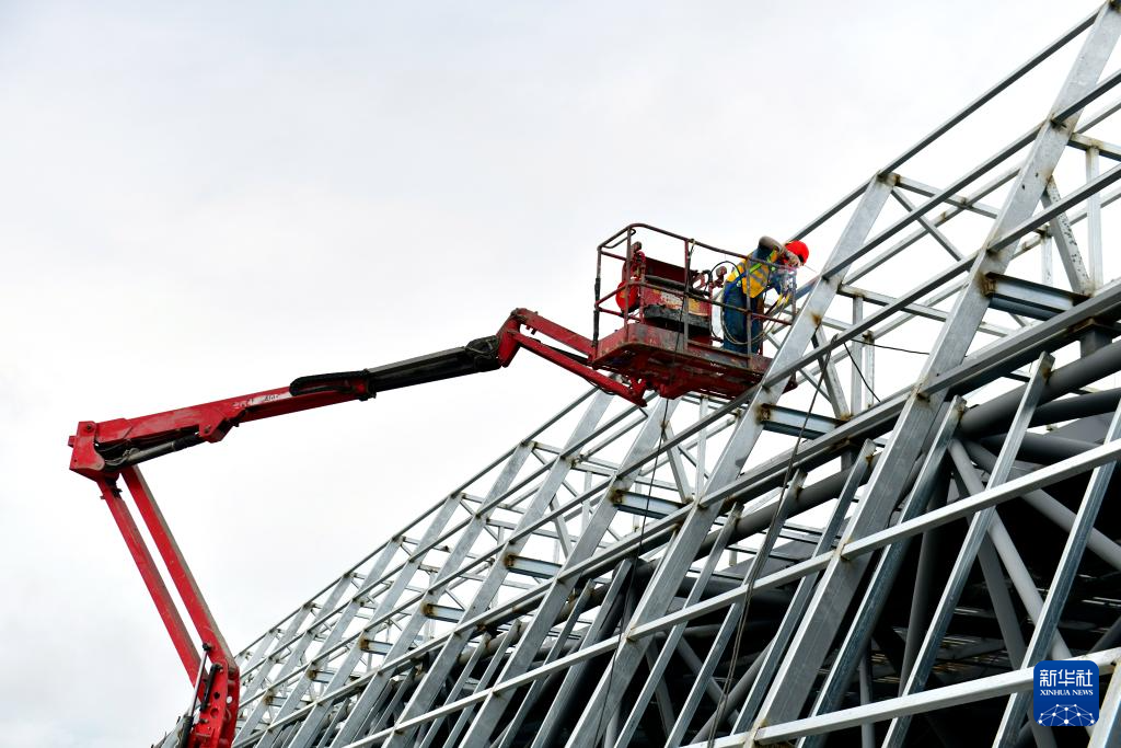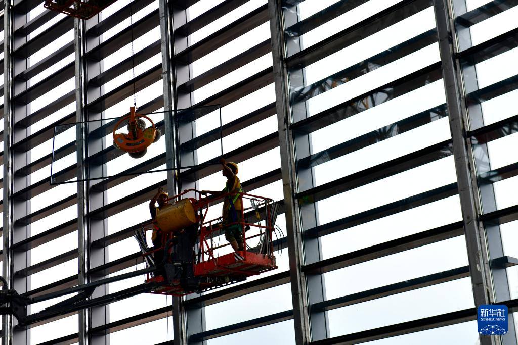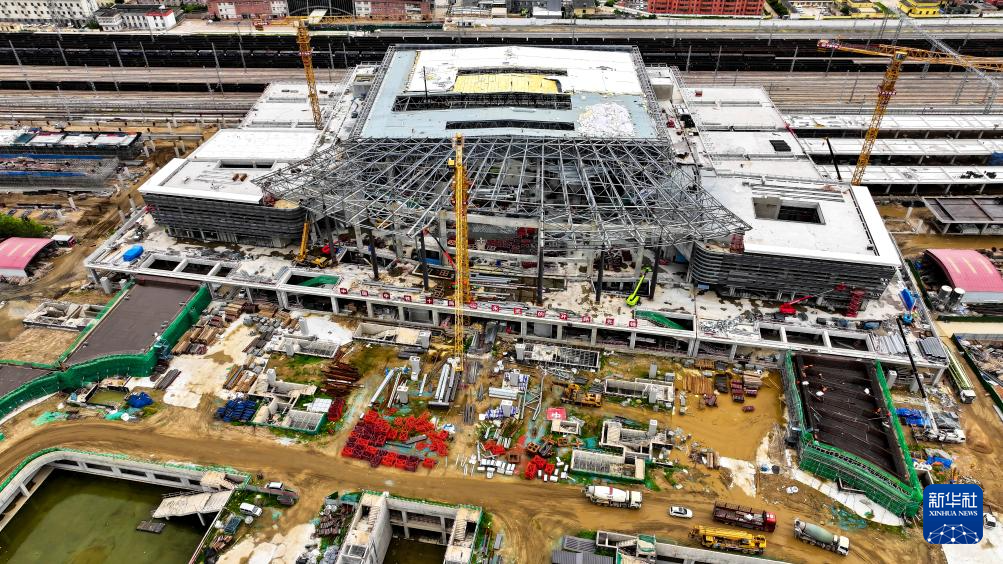 7月22日,工作人员在山东日照火车站新建站房工程现场施工。