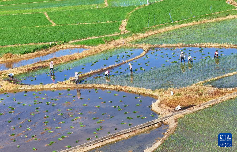 7月22日,湖南省衡阳市衡东县霞流镇农民进行晚稻插秧工作(无人机照片)。