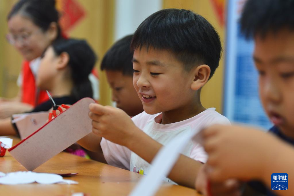 7月22日,小朋友们在体验剪纸。
