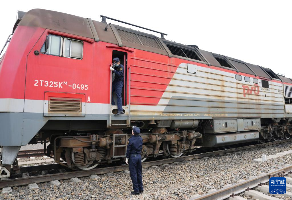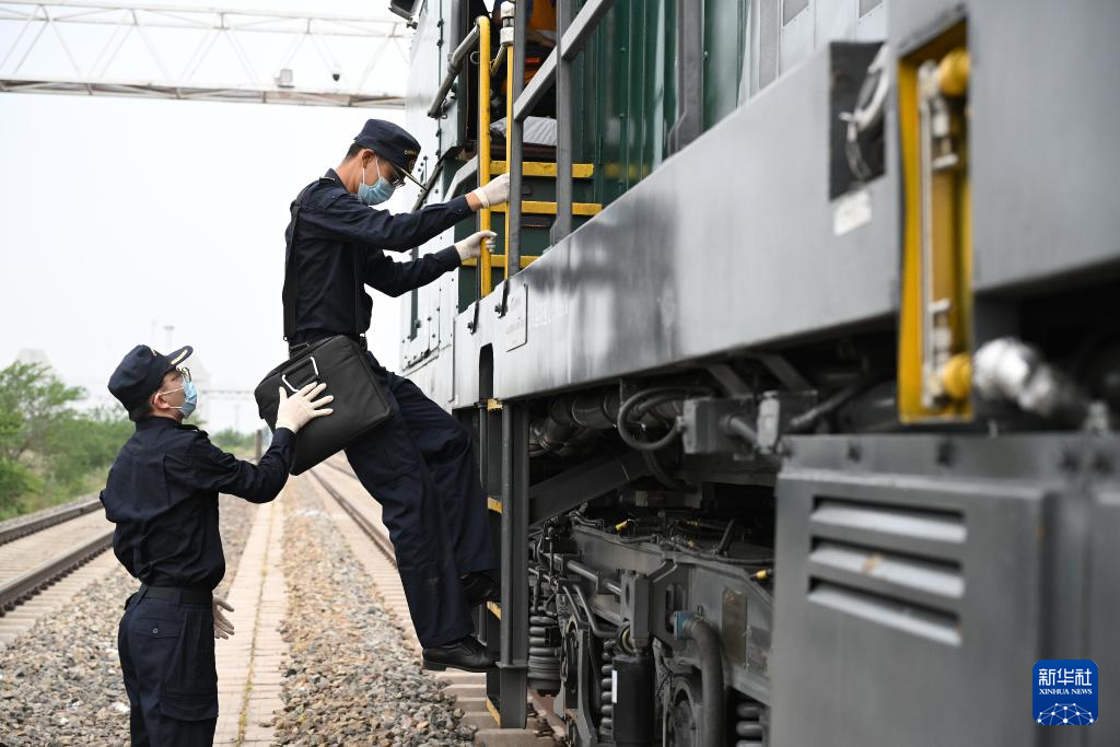 两名满洲里海关工作人员对停靠在内蒙古满洲里铁路口岸的中欧班列货运列车进行巡检(7月17日摄)。
