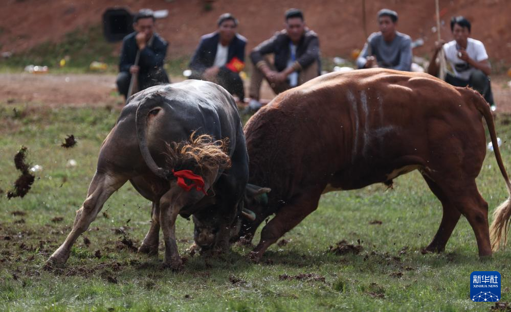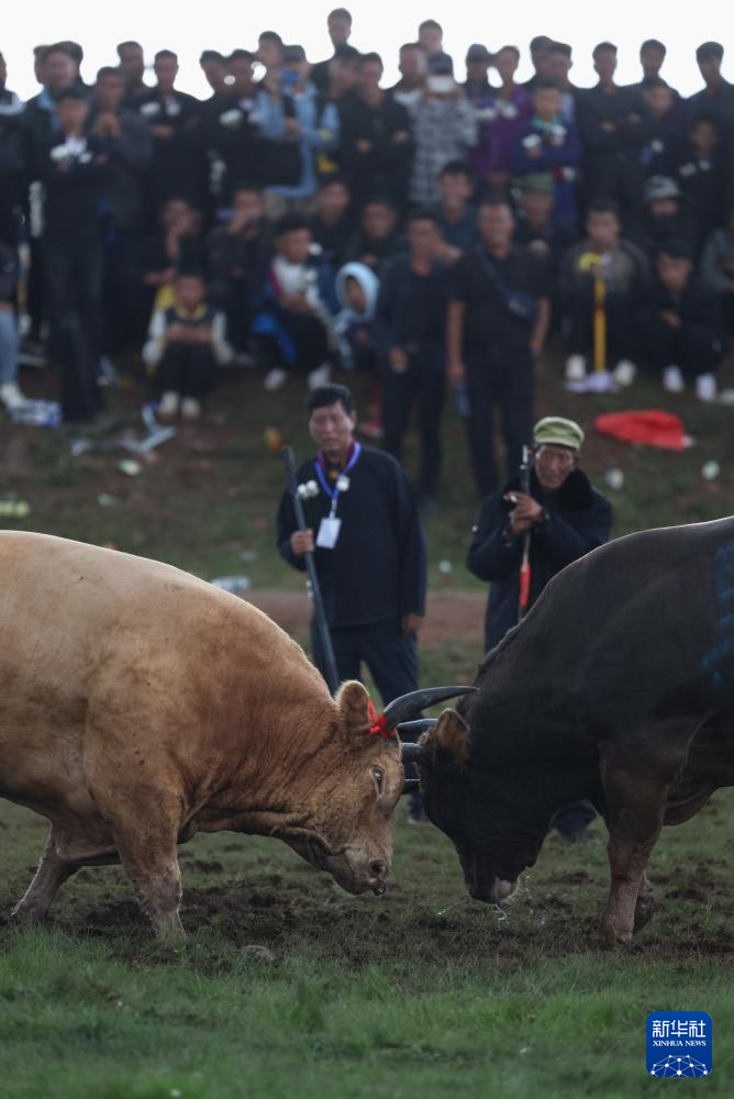 斗牛,彝语意为“牛顶”,与西班牙斗牛人与牛斗不同,是两匹公牛之间相斗。比赛时参赛的公牛被牵到一起进行顶力和耐力较量,直至一方体力不支夺路而逃。胜者高昂着头,牛的主人也高兴不已,败方则垂头丧气,现场时时引发观众欢呼。