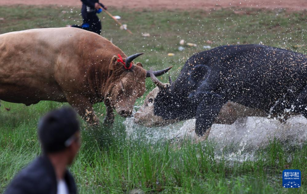 7月21日,四川省布拖县俄里坪镇火把场,两头在水中相斗的公牛溅起水花。