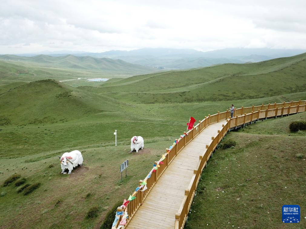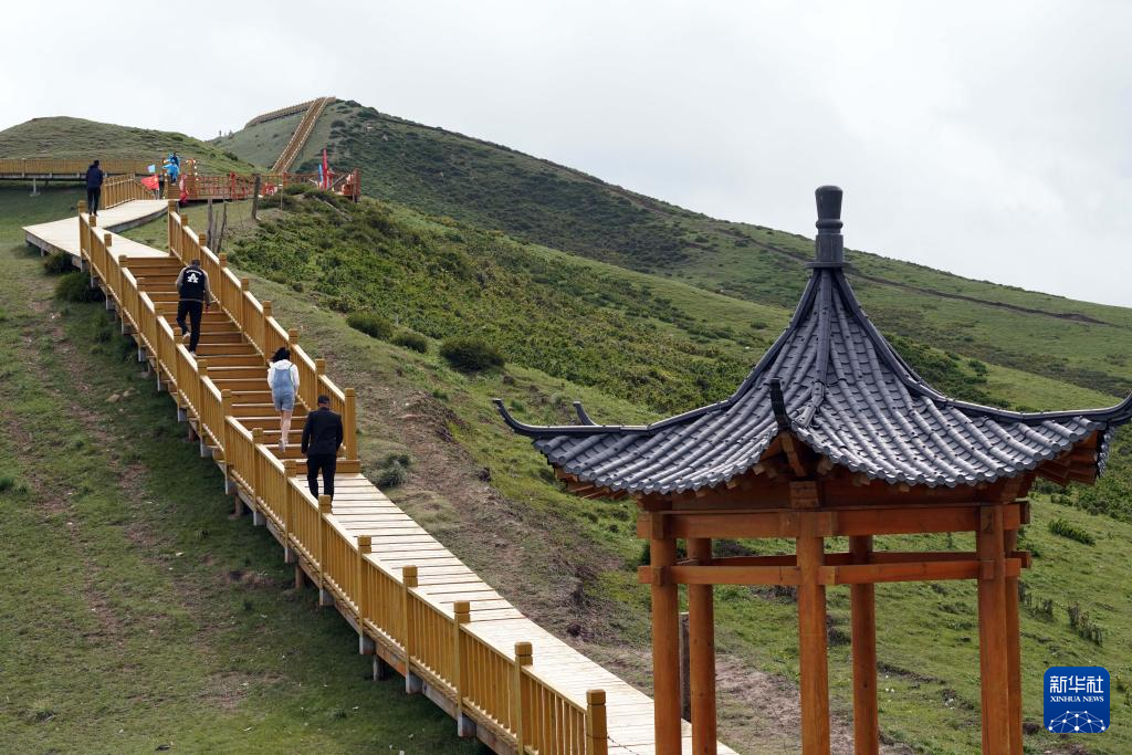 7月8日,游客在乌鞘岭上的木栈道上游览赏景。