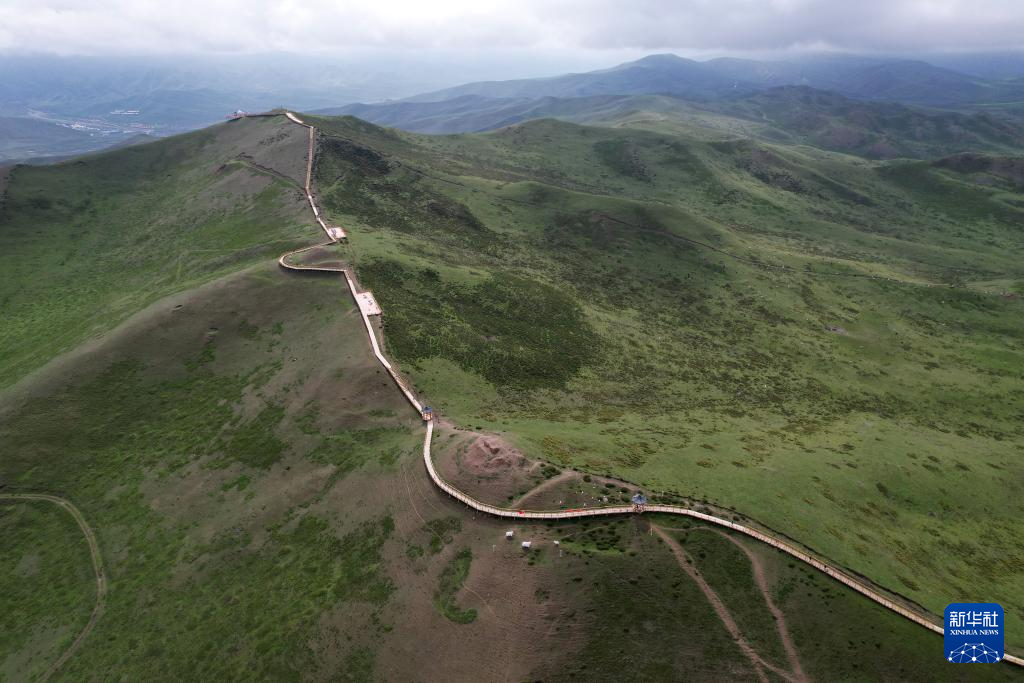 7月8日,游客在乌鞘岭上的木栈道上游览赏景(无人机照片)。