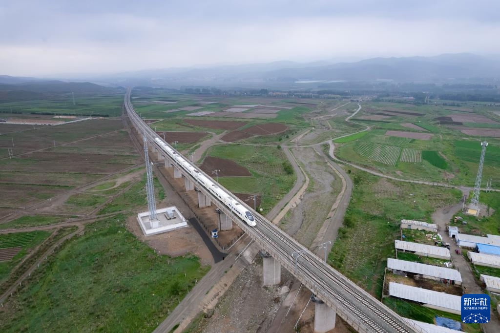 7月8日,列车行驶在乌鞘岭下的兰张高铁兰武段上(无人机照片)。