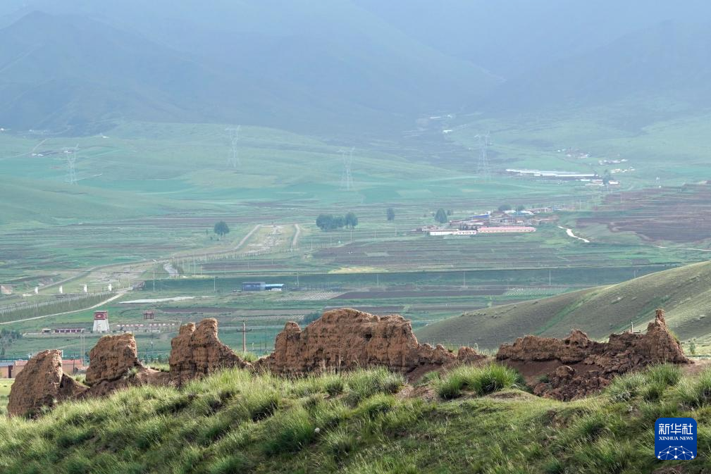 7月8日拍摄的乌鞘岭下的明长城和远处的村庄。