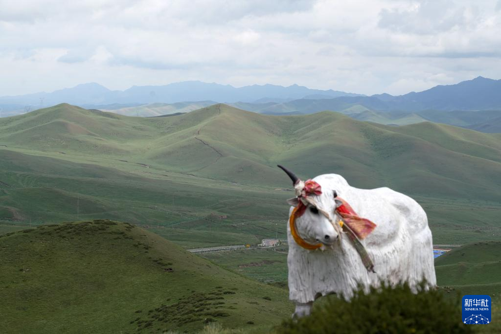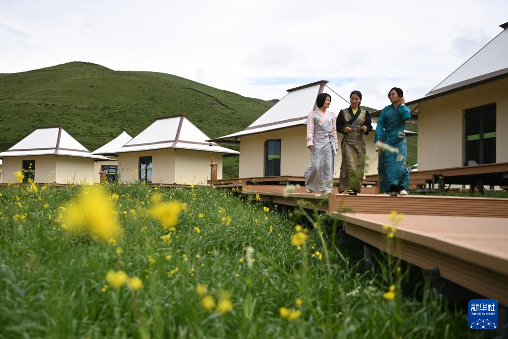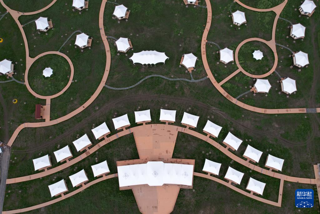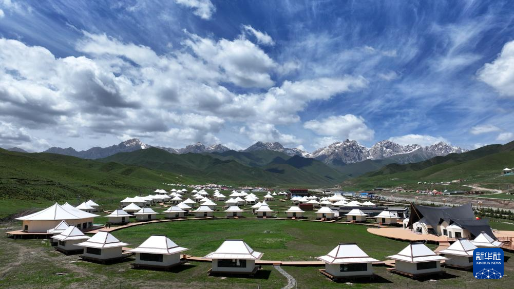 6月21日拍摄的抓喜秀龙草原帐篷城,远处为马牙雪山(无人机照片)。