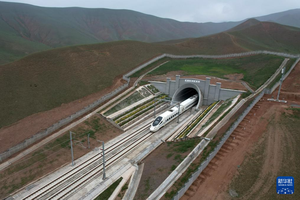 7月8日,在兰张高铁兰武段,列车驶出新乌鞘岭隧道(无人机照片)。