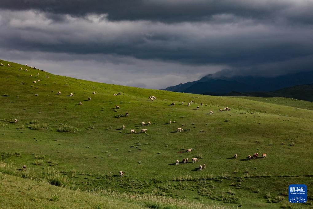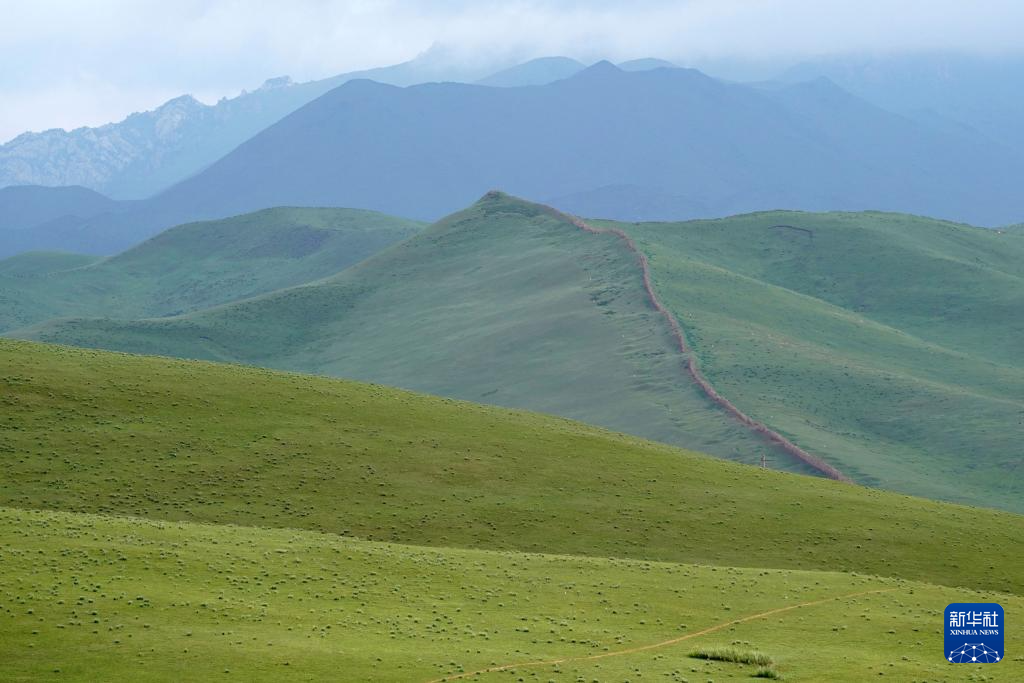7月8日,羊群在乌鞘岭下的草场上觅食。