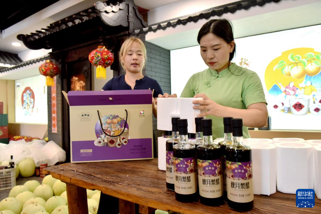 7月23日,在威县一家梨醋生产企业,工作人员在包装梨醋产品。