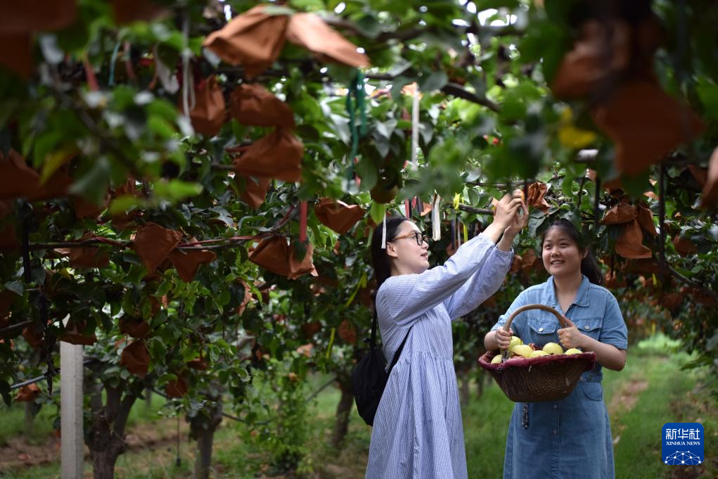 7月23日,游客在威县袁家庄村梨园内采摘梨果。