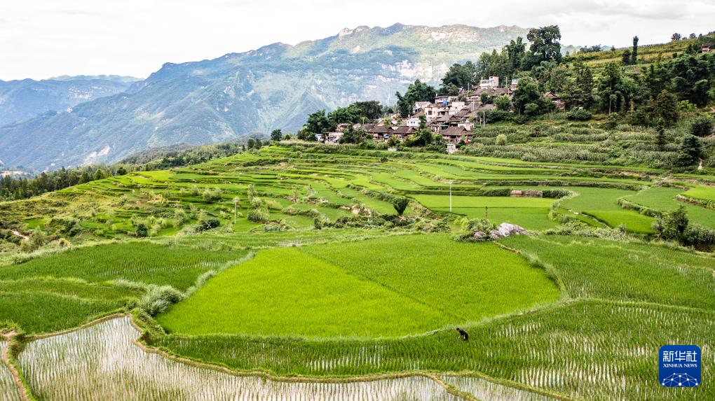 天门村的远山、树林、梯田、民居构成了美丽的田园画卷(7月16日摄,无人机照片)。