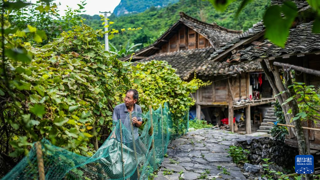 天门村村民陆风选干完农活返回自家吊脚楼下(7月16日摄)。