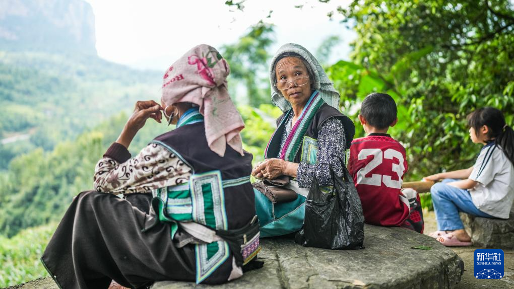 天门村村民陆大珍(左)、王兴珍在吊脚楼上制作绣片(7月16日摄)。