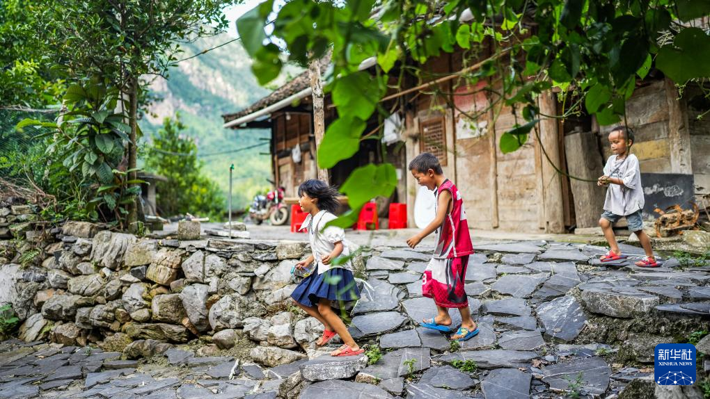 小朋友从天门村一处石板路上经过(7月16日摄)。