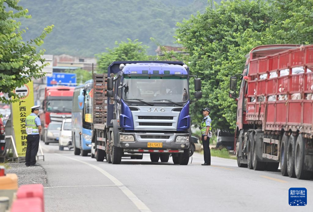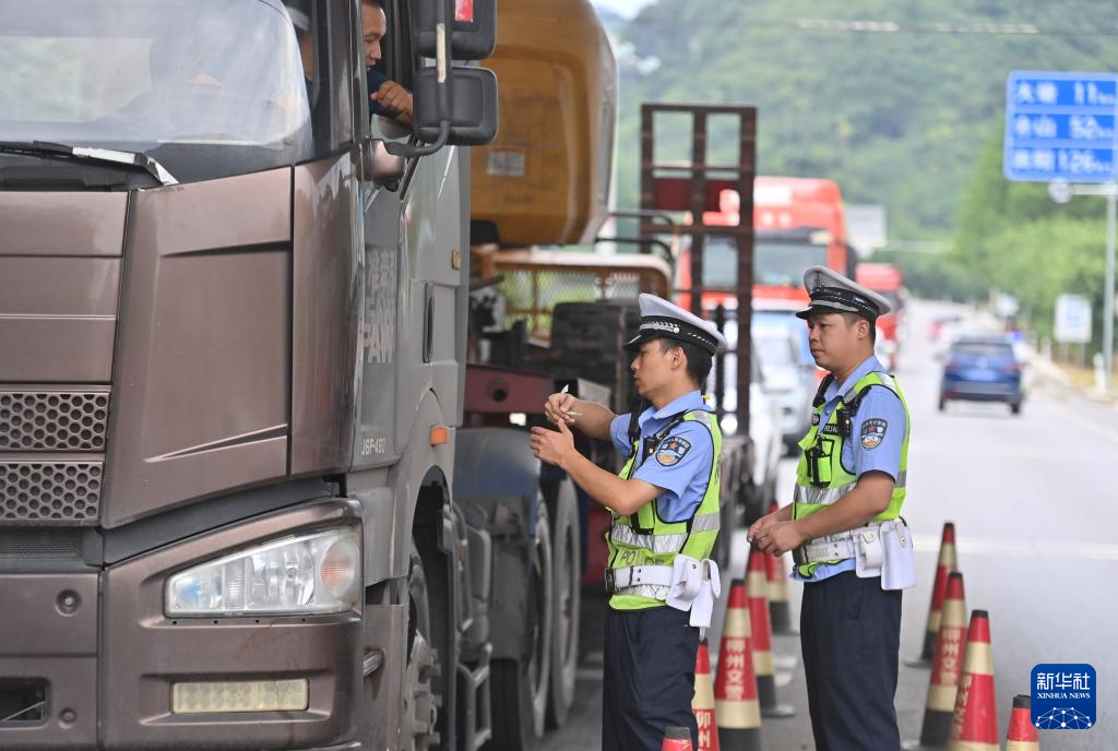 7月23日,在广西柳州市柳江区里高镇,警务人员在检查货车司机是否存在疲劳驾驶行为。
