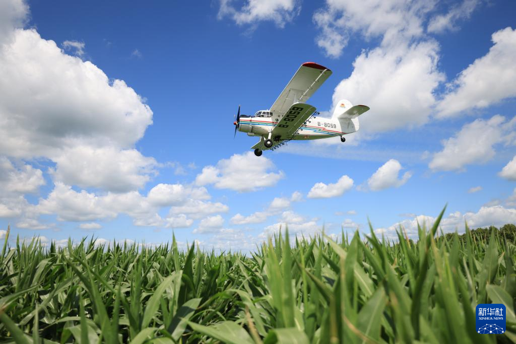 7月22日,在北大荒集团北安分公司赵光农场有限公司第三管理区玉米地块,农用飞机在进行航化作业。