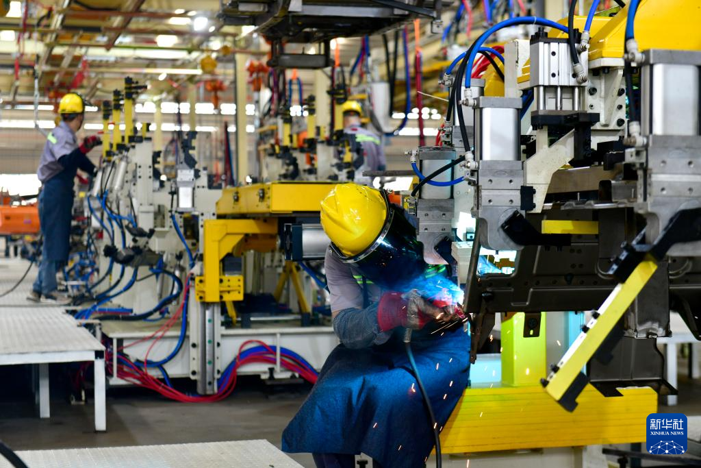 7月24日,在山东永利新能源车业有限公司,工作人员在流水线上焊接高尔夫球车车架。