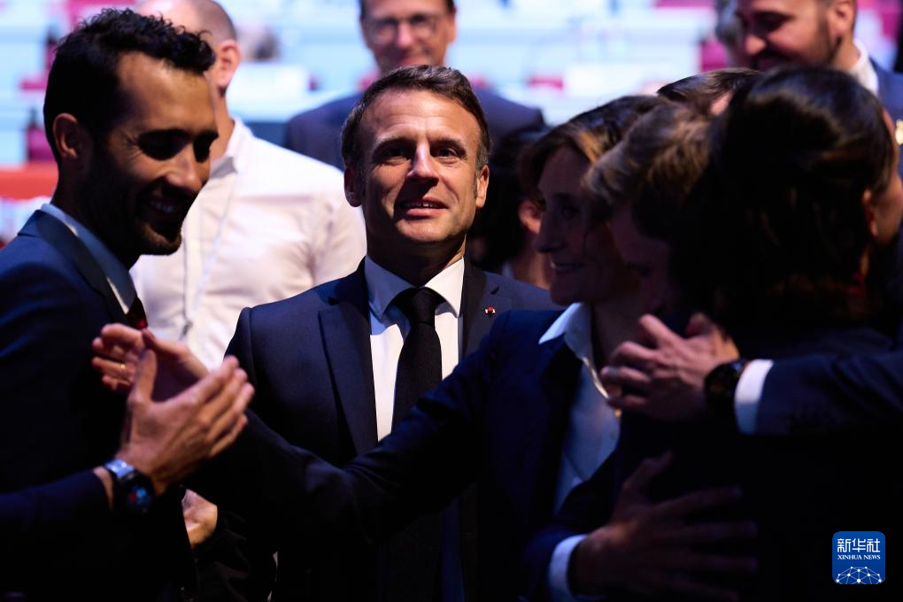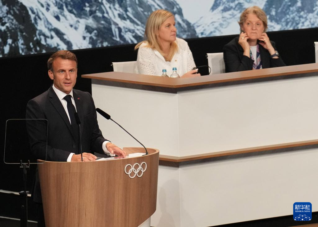 7月24日,法国总统马克龙(中)庆祝法国阿尔卑斯山地区获得2030年冬奥会举办权。