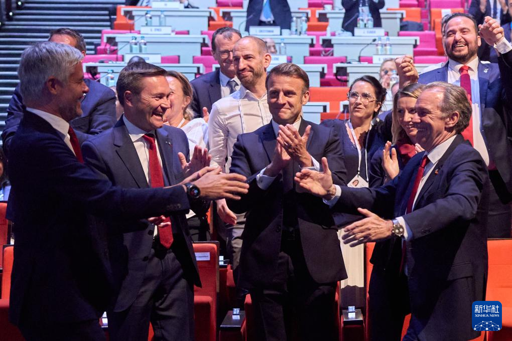 7月24日,法国总统马克龙(前中)与法国代表团成员庆祝阿尔卑斯山地区获得2030年冬奥会举办权。