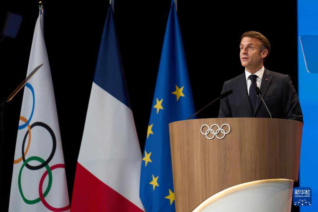 7月24日,法国总统马克龙(左四)、国际奥委会主席巴赫(中)等在会议现场合影。