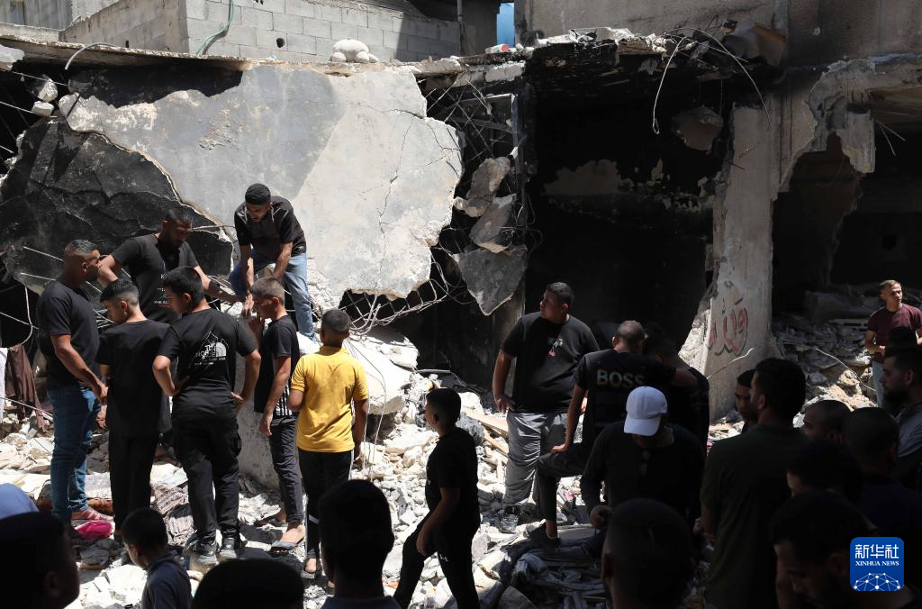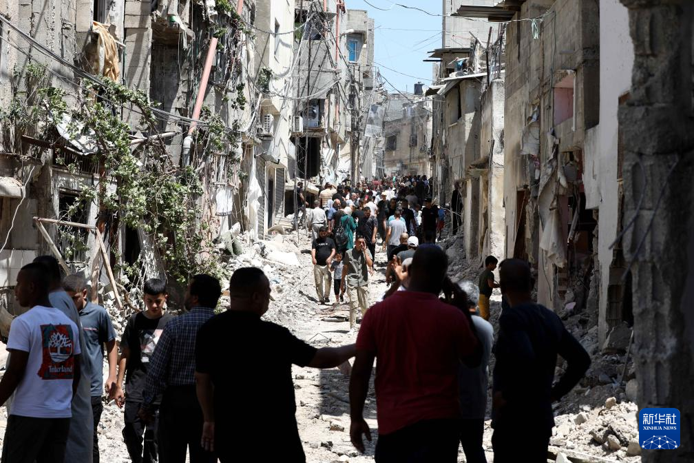 7月23日,在约旦河西岸北部图勒凯尔姆,人们查看以军毁坏的建筑。