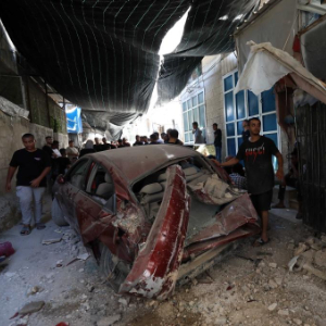 7月23日,在约旦河西岸北部图勒凯尔姆,人们查看以军毁坏的建筑和汽车。