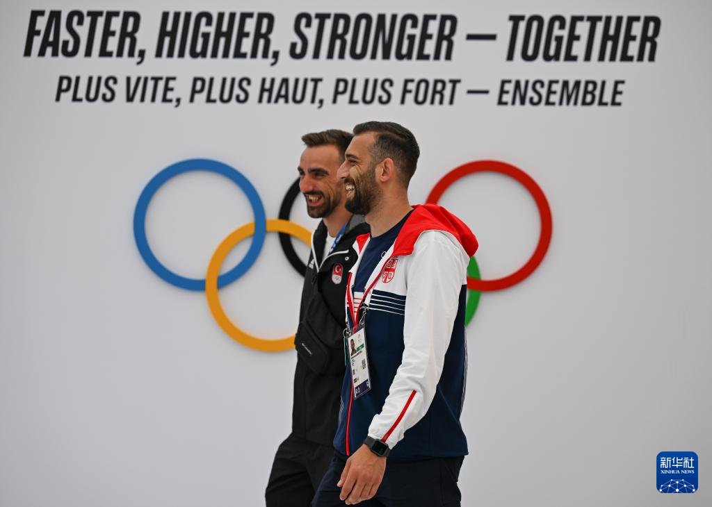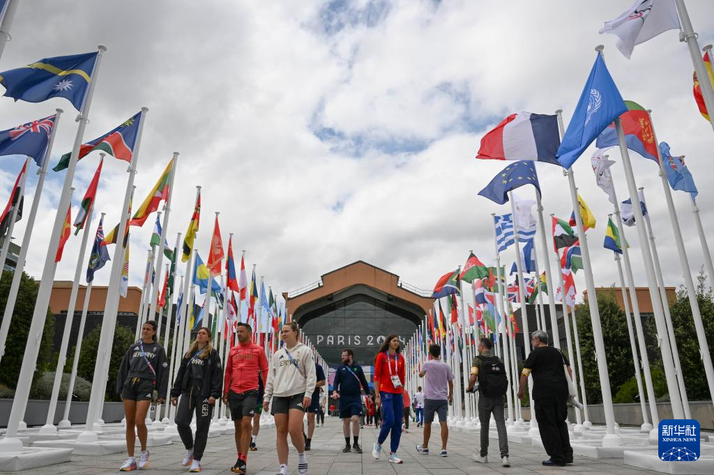7月23日,来自不同代表团的运动员、工作人员在巴黎奥运村内休闲、交流。