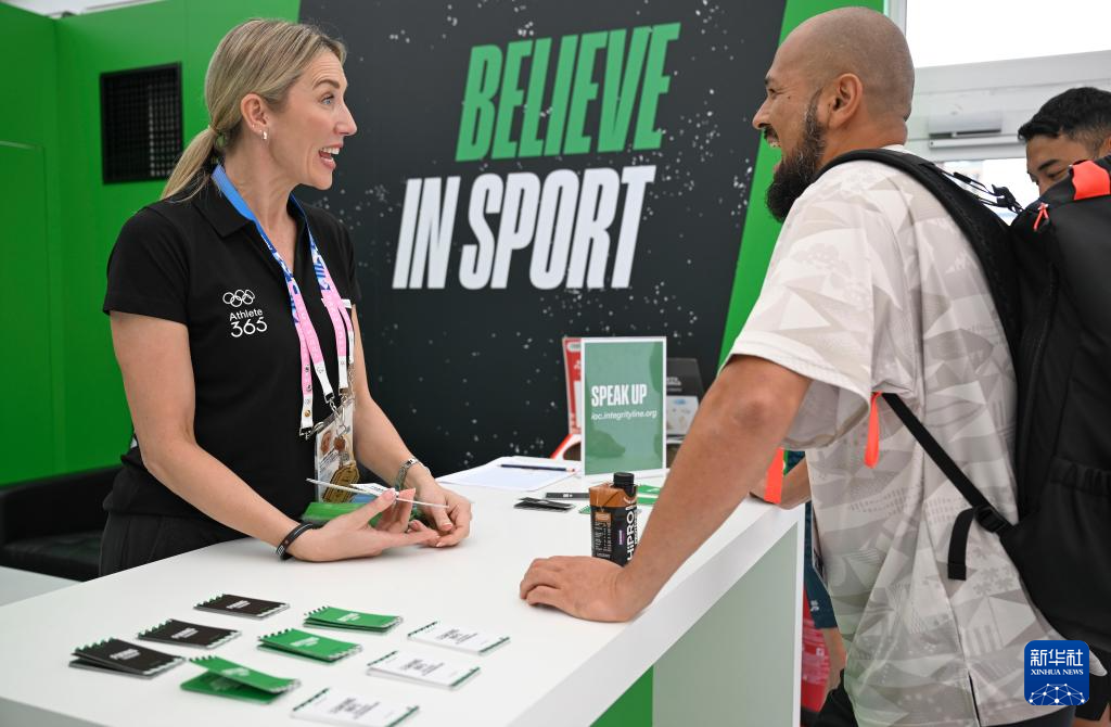 7月23日,来自中国的志愿者李柳立(左)在巴黎奥运村为运动员提供咨询服务。