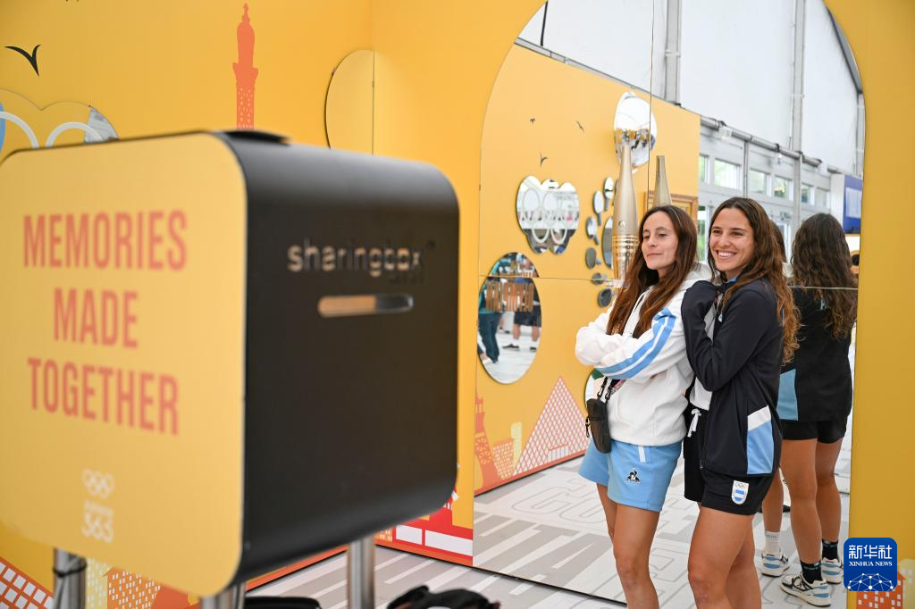 7月23日,两名阿根廷体育代表团成员在巴黎奥运村“运动员365小屋”内合影。