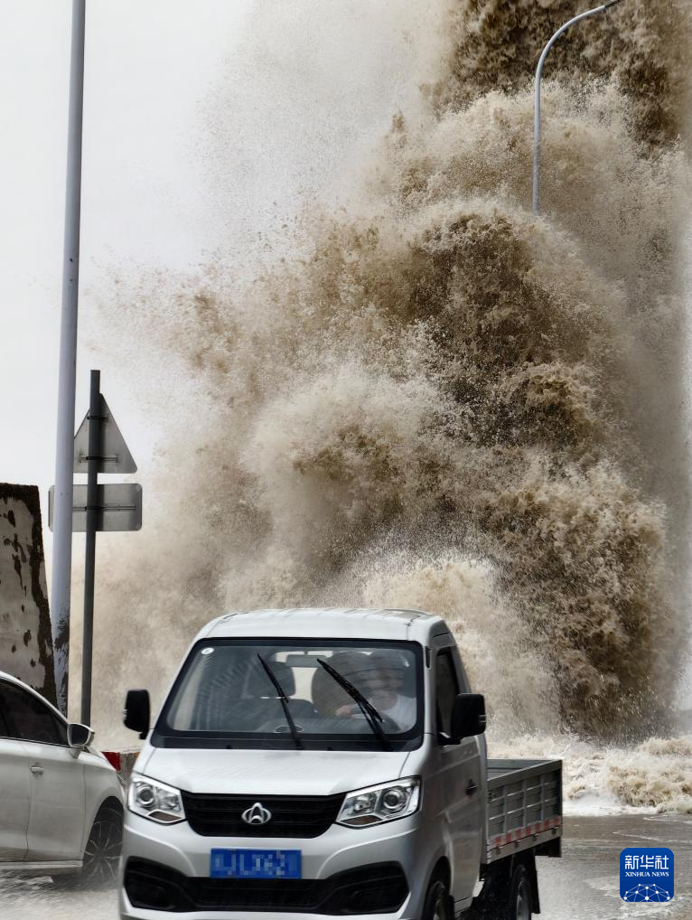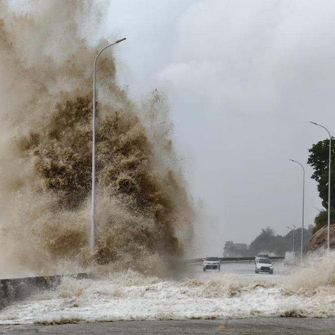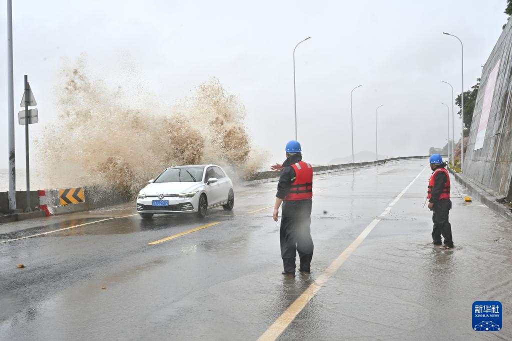 7月25日,福建省宁德市霞浦县三沙镇沿海出现巨浪,防台人员现场指挥滞留车辆尽快撤离至安全区域。