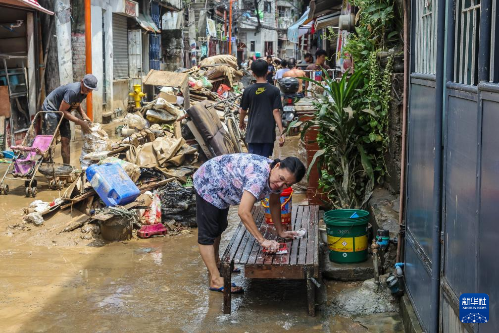 7月25日,居民在菲律宾马里基纳市清洗遭洪水浸泡过的个人物品。