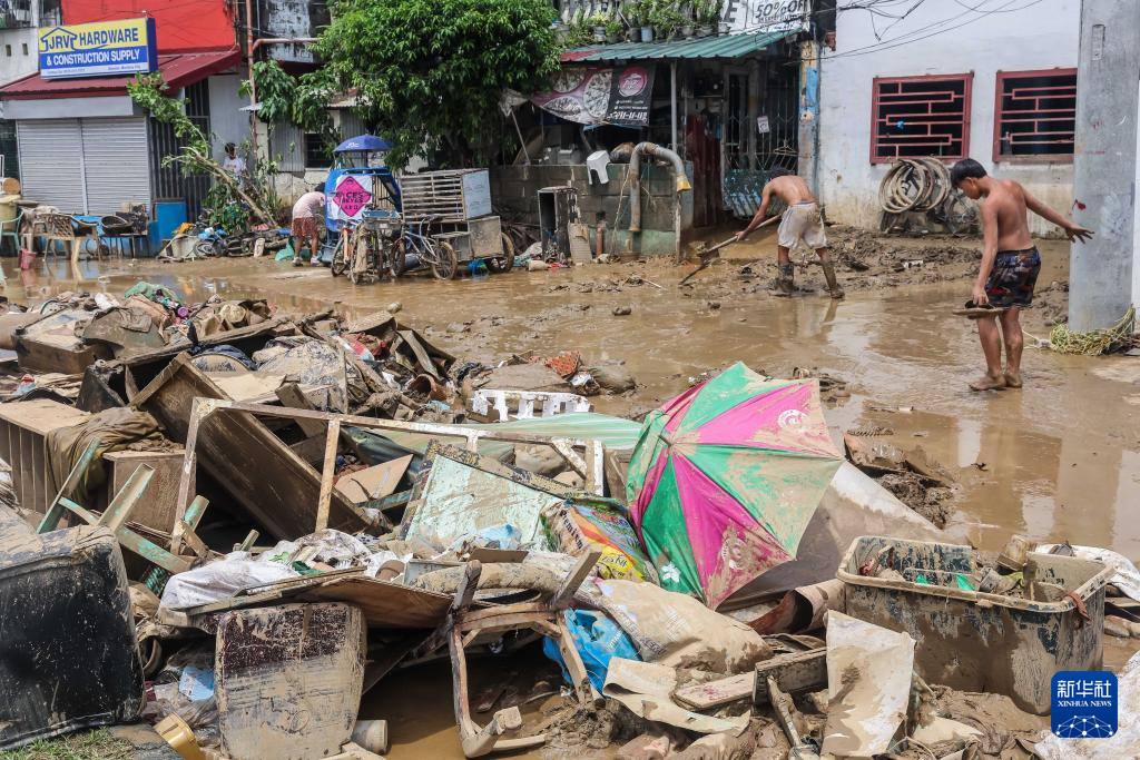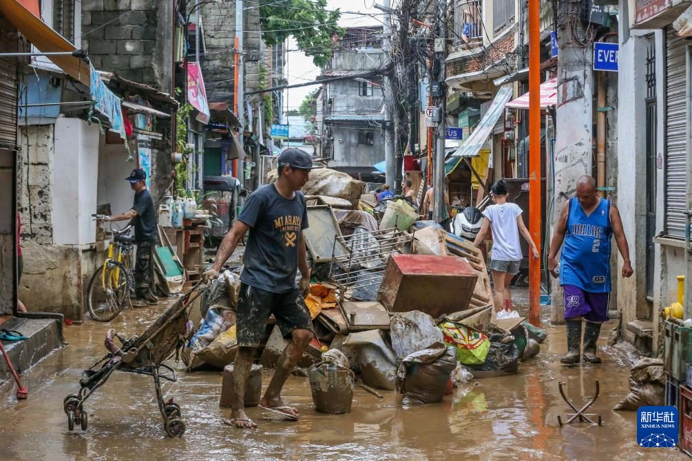 7月25日,居民在菲律宾马里基纳市清理遭洪水侵袭的街道。