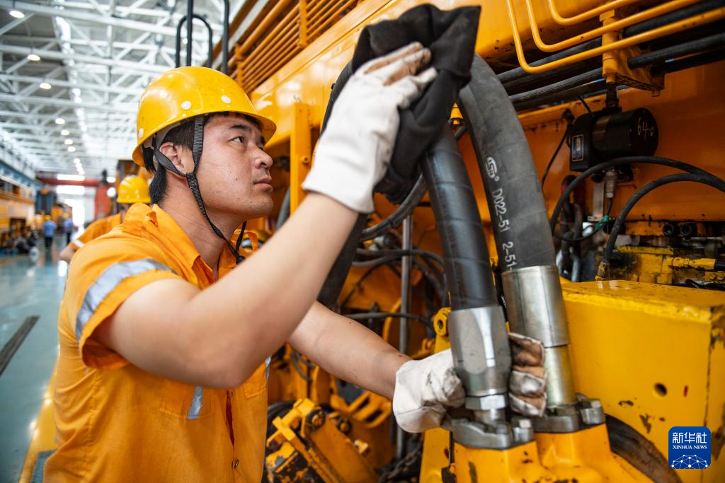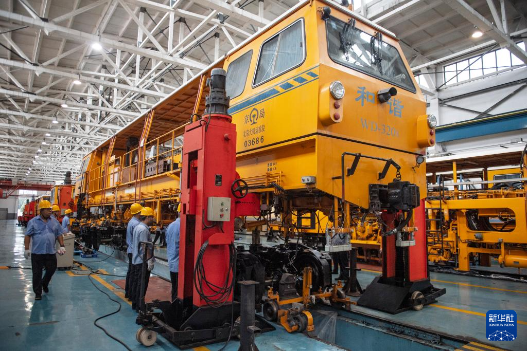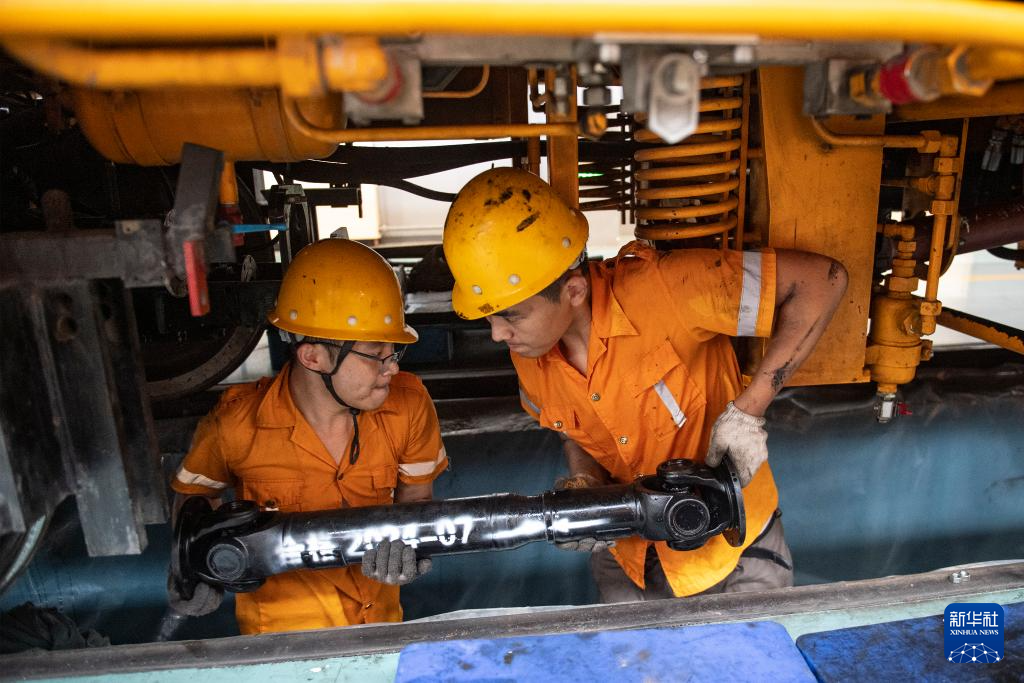 7月25日,在国铁北京局北京大型养路机械运用检修段的检修库,职工安装机械车传动轴。